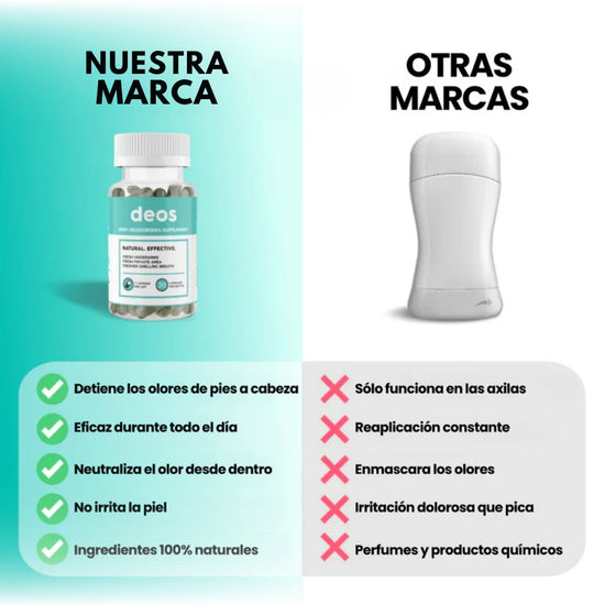 Los desodorantes tradicionales solo enmascaran el olor corporal, pero no resuelven el problema de fondo. A lo largo del día, el sudor y las bacterias vuelven a generar olores desagradables, obligándote a reaplicar desodorante constantemente. Con Deos™, actúas desde adentro, ayudando a tu cuerpo a neutralizar las toxinas y bacterias antes de que causen mal olor.